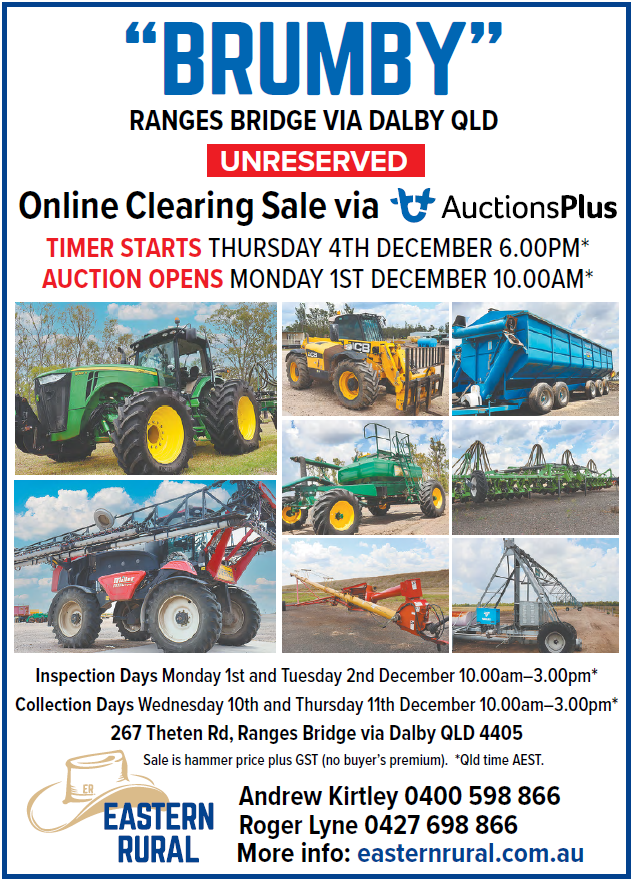 “Brumby" Clearing Sale Auction Opens 10:00am December 1st 2025 Looking for more Clearing Sale information? Contact the team today on 07 4593 6050 or add your details below to be included in upcoming Clearing Sale news. Contact Us Your Name (required) Your Email (required) Your Phone Number (required) Subject Your Message This site is protected by reCAPTCHA and the Google Privacy Policy and Terms of Service apply. Δ